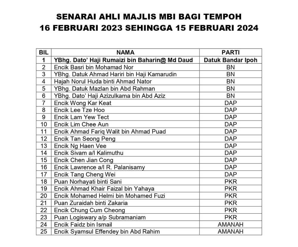 A total of 24 Ipoh city councillors took their oaths this morning in a closed-door event at the Ipoh City Council office. Their term of office began on 16th February 2023 and will last until 15th February 2024.