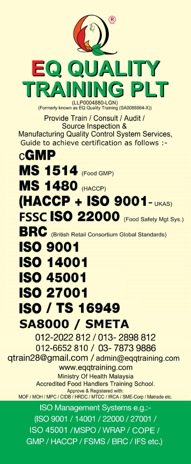 Accredited by the Ministry of Health Malaysia, EQ Quality Training PLT provides training, ISO management consultancy and pre-audit support for businesses seeking compliance, certification and operational excellence.