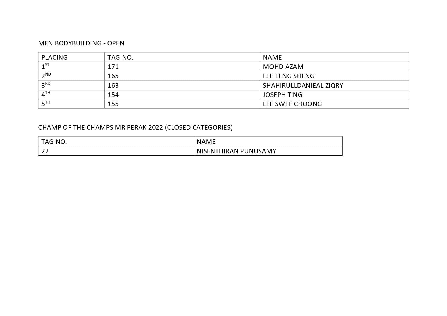 The competition was keen but friendly, as all winners have a shot for the national championship which will be held this August in the state of Kedah. With the wrapping up of Mr Perak 2022, Persatuan Bina Badan Negeri Perak has its eyes on bringing the championship to greater heights by introducing international participants and establishing Mr Perak as an international event to be reckoned with.