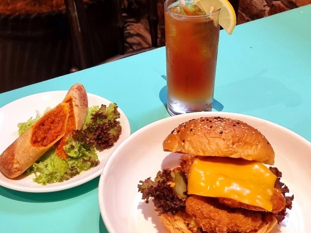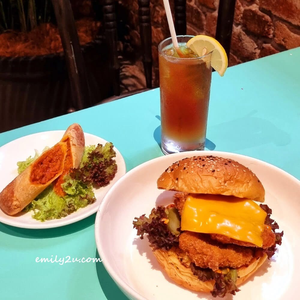 We gave the new set lunch menu a go and opted for the Chicken Bolognese spring roll (#4) as our starter and for our main dish, the Crispy Chicken burger with Sriracha Aioli, cheddar cheese, lettuce and gherkin (#1).