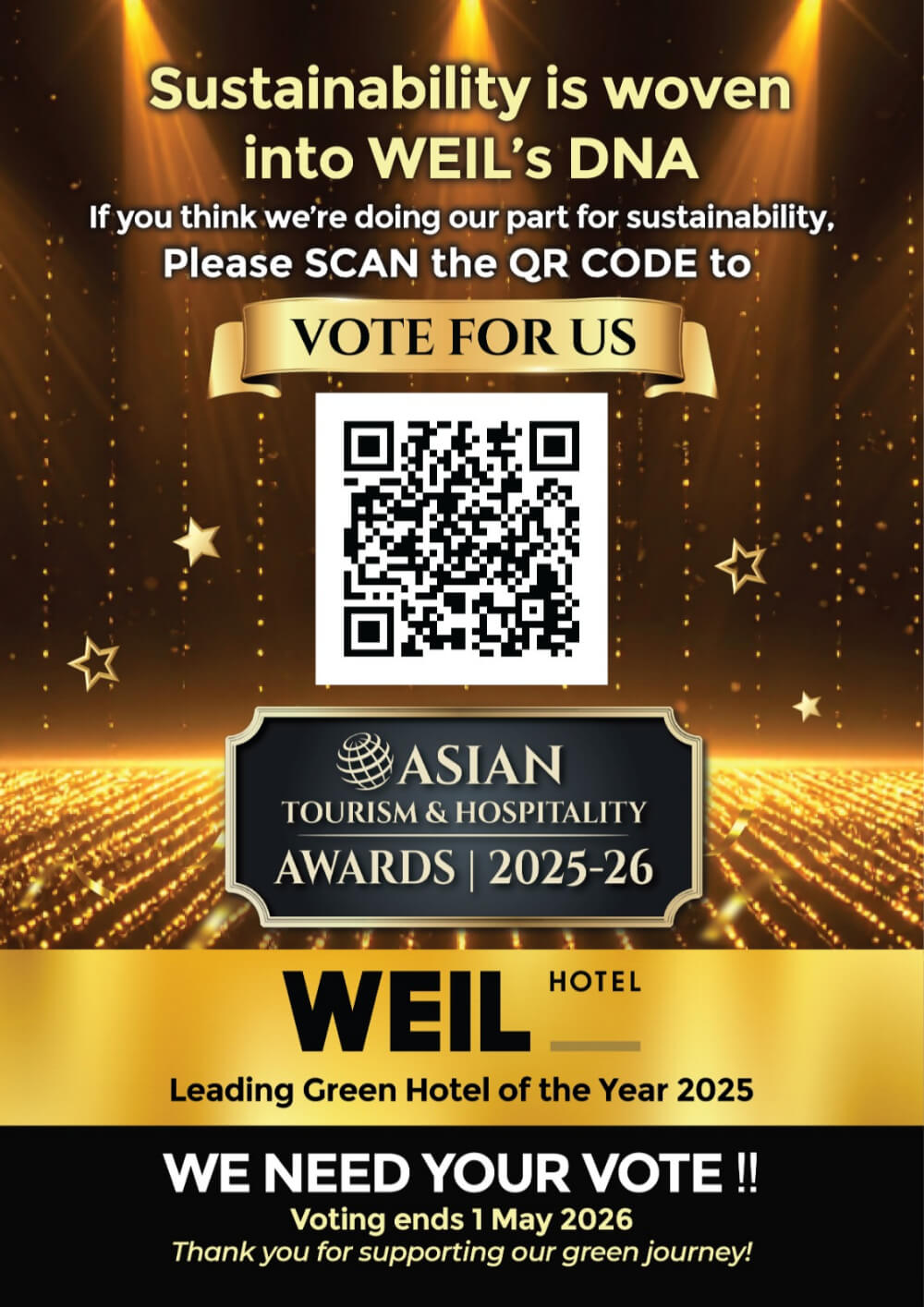 If you believe in the importance of responsible hospitality and the efforts being made, do take a moment to show your support. Simply scan the QR code and cast your vote for WEIL Hotel. Voting closes on 1st May 2026, so be sure to have your say before the deadline.